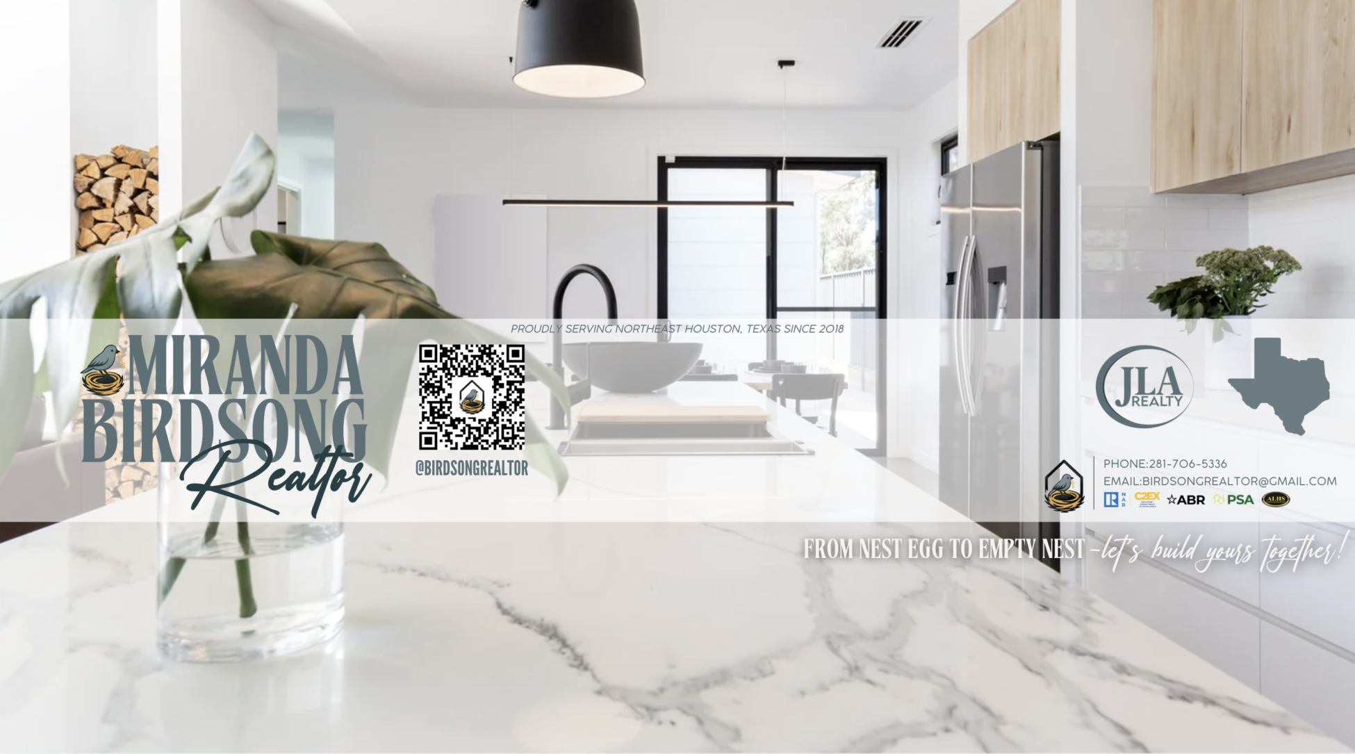 | About | Meet native Houstonian and Licensed Texas REALTOR®, Miranda Birdsong. Born and raised in her hometown of Huffman, just northeast of Houston, Miranda has been a licensed REALTOR® since 2018 and brings more than 10 years of experience in the real estate industry. As a local Northeast Houston Realtor, she helps buyers and sellers feel confident, informed, and supported every step of the way. Miranda believes real estate should feel clear, personal, and not overwhelming. Her approach is built on strong communication, strategic negotiation, deep rooted local knowledge, and a genuine commitment to her clients. She is proud to serve her community and the people who call it home. Miranda’s mission with each client is to understand their unique needs and help them exceed their real estate goals with dedication, integrity, and a focus on what matters most to you. Helping Build Nests in Northeast Houston since 2018 Services include:• First Time Home Buyers• New Construction• Listing Agent Representation• Buyer’s Agent Representation• Buy, Sell, or Relocate• Investment Properties• Luxury Homes• Downsizing or Upsizing Proudly serving Northeast Houston:Huffman, Dayton, Crosby, Kingwood, Humble, Atascocita, Liberty, New Caney, Porter, Splendora, and surrounding areas. Professional Memberships:• Texas REALTORS®• National Association of REALTORS®• Houston Association of REALTORS® (HAR Platinum)• Luxury Home Council Designations and Certifications:• C2EX Commitment to Excellence• Pricing Strategy Advisor (PSA)• Accredited Buyer’s Representative (ABR®)• Accredited Luxury Home Specialist (ALHS®) Whether you are buying, selling, or exploring new construction, Miranda is here to help you fly home. @birdsongrealtor Required Texas Disclosures Information About Brokerage Services:https://www.har.com/mhf/terms/dispBrokerInfo?sitetype=aws&cid=714548&token=550d44b0e4d8f8b8fb7784b667a88f57 TREC Consumer Protection Notice:https://content.harstatic.com/pdf/TREC_CPN.pdf |