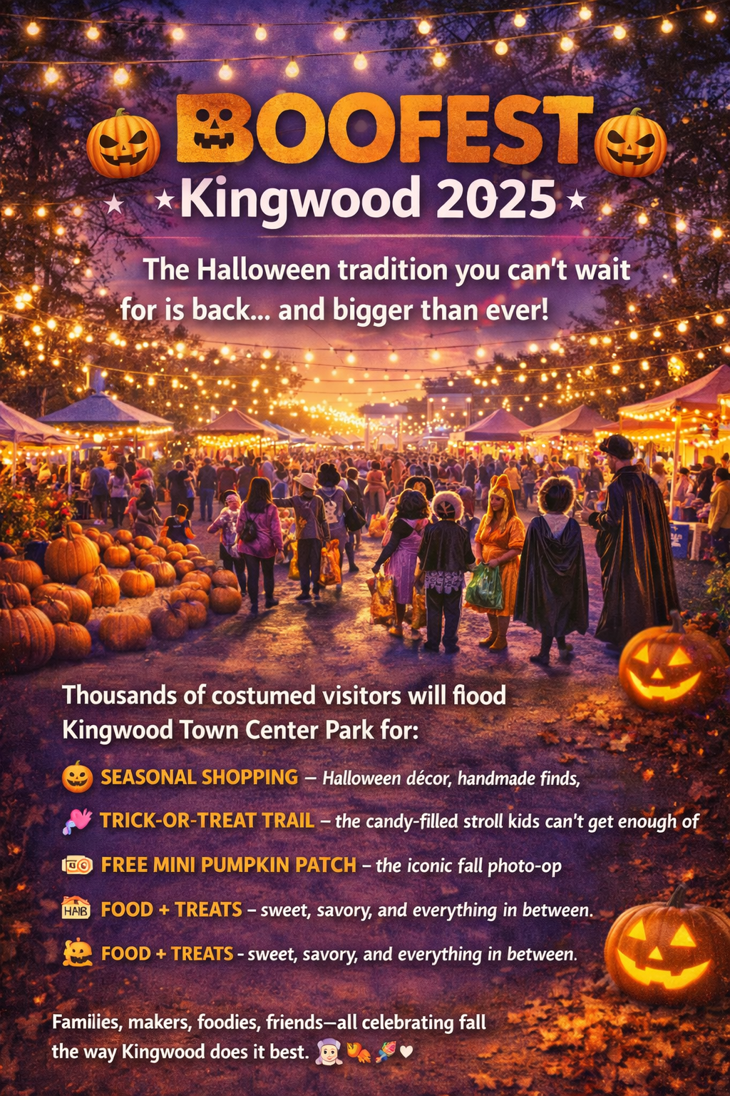 Thousands of visitors will take over Kingwood Town Center Park for an afternoon of fall fun, local shopping, and all the cozy Halloween energy you can handle.