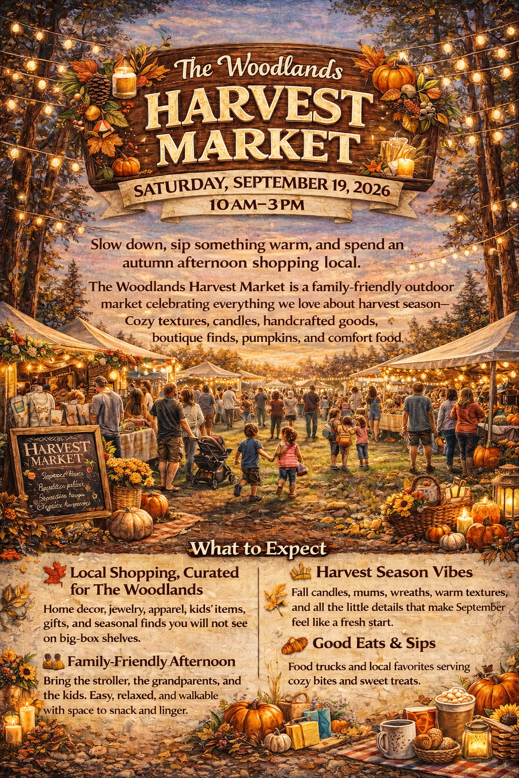 The Woodlands Harvest Market is a family-friendly outdoor market celebrating everything we love about harvest season: cozy textures, candles, handcrafted goods, boutique finds, pumpkins, and comfort food, all in one beautiful afternoon close to home.